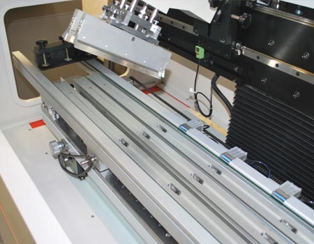 SP400 絲印機是一款在線式高精度的LED 錫膏印刷機,適合用于LED 燈條的批量化生產使用,PCB 板通過傳輸系統被固定在設計巧妙而靈活的工作平臺上,該平臺適用于所有單面和雙面電路板(選配夾具),PCB 板位置的調整、工作平臺的移動、刮刀的升降,都是經由精密導軌導向運動,并且配合變頻馬達的傳動,可確保非常準確的運動精度以及高的重復精度。是目前絲印LED 電板板生產的理想選擇。